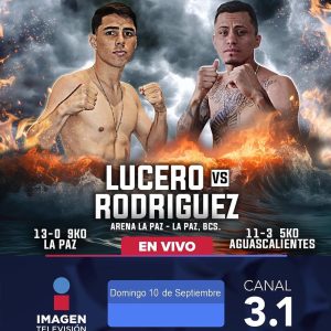 En la pelea semiestelar, el púgil sudcaliforniano Isaac “Bestia” Lucero Jr., invicto con un récord de 13 victorias, 9 por la vía del nocaut, se medirá a Leonel Rodríguez, quien tiene en su haber 11 triunfos, 5 por cloroformo y 3 reveses, disputando campeonato welter de la Federación del Caribe de Box de la WBC.