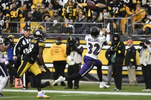 Baltimore Ravens safety Marcus Williams (32) intercepts a pass intended for Pittsburgh Steelers wide receiver Diontae Johnson during the second half of an NFL football game in Pittsburgh, Sunday, Dec. 11, 2022. (AP Photo/Don Wright)