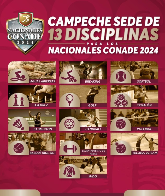 Con una delegación de poco más de 700 deportistas, Campeche está listo para dar la bienvenida a los Nacionales CONADE 2024. Que se realizará en la capital del Estado y en el municipio de Carmen con 13 disciplinas, del 6 de mayo al 3 de julio.
