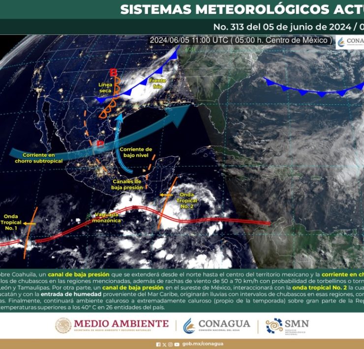 Península de Yucatán: Se prevé cielo medio nublado en la región, con lluvias aisladas en Quintana Roo. Por la mañana, ambiente fresco. Durante la tarde, ambiente templado. Viento del este y noreste de 5 a 15 km/h con rachas de hasta 35 km/h en Campeche, Yucatán y Quintana Roo.