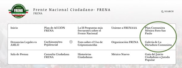 La página oficial de FRENA asegura que la denominada 4T tiene un perfil “socialista-comunista” porque en 2018 “la pandilla Morena” firmó un contrato de adhesión a la declaración de principios del Foro de Sao Paulo, donde se comprometió a “ejecutar las políticas de tipo socialista”. Imagen: FRENA.
