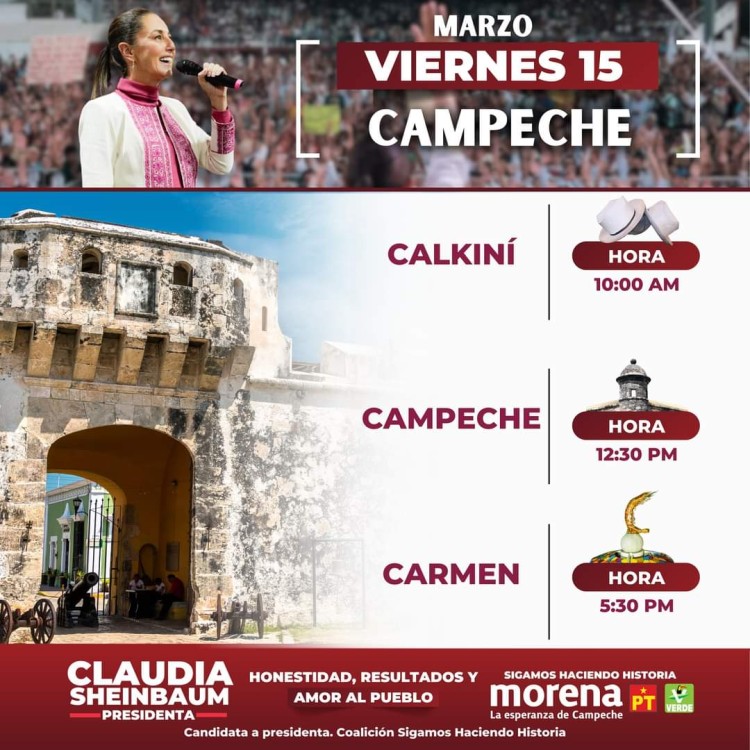 El Comité Estatal de Morena informó la visita de su candidata presidencial, Claudia Sheinbaum Pardo este 15 de marzo para reunirse con ciudadanos. Y es que primeramente se informó que la aspirante a la presidencia de México visitaría tres de los 13 municipios de Campeche.
