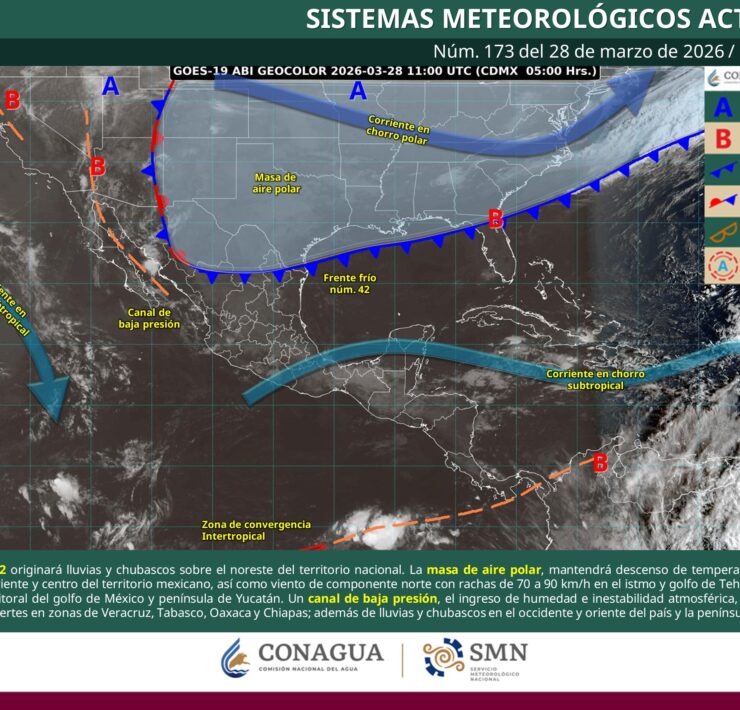 Pacífico Norte: Cielo despejado a parcialmente nublado durante el día, sin probabilidad de lluvia. Por la mañana ambiente fresco a frío; muy frío con posibles heladas en sierras de Sonora. Ambiente cálido por la tarde y caluroso en zonas de Sonora. Viento de componente oeste de 15 a 30 km/h en la región, con rachas de hasta 45 km/h.