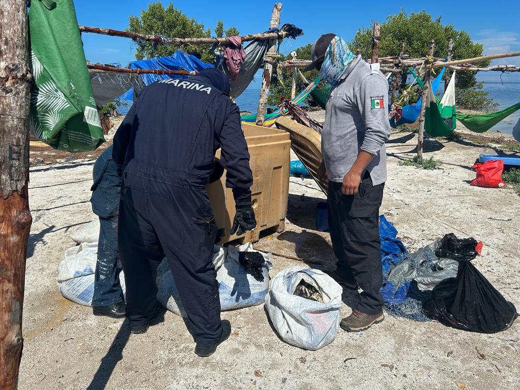 Localizan campamento clandestino en Campeche, siendo detenido una persona por traficar productos marinos en veda.