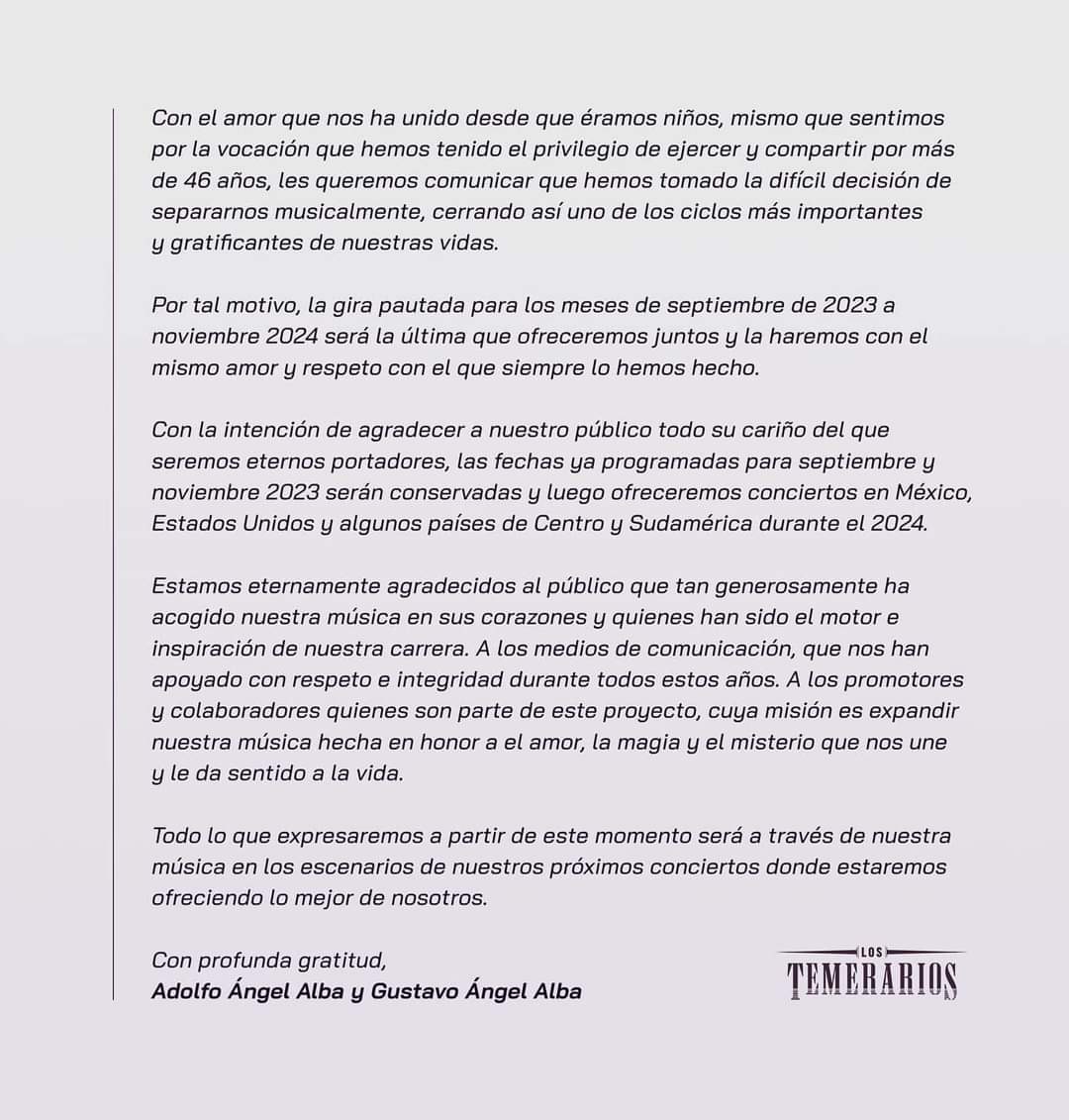 Los Temerarios se separan. Tras de 46 años de trayectoria, este lunes la agrupación mexicana conocida como Los Temerarios anunciaron su separación, por lo que su gira que está por comenzar será la última que realicen los hermanos Adolfo Ángel y Gustavo Ángel Alba.