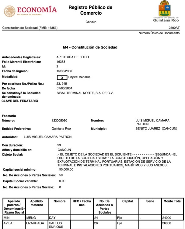 Sisal Terminal Norte SA de CV, constituida en 2006 en Cancún, dedicada a la construcción, operación y explotación de terminal portuarias, donde aparece como accionista junto al taiwanés Day Min Meng.