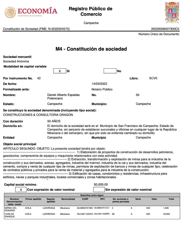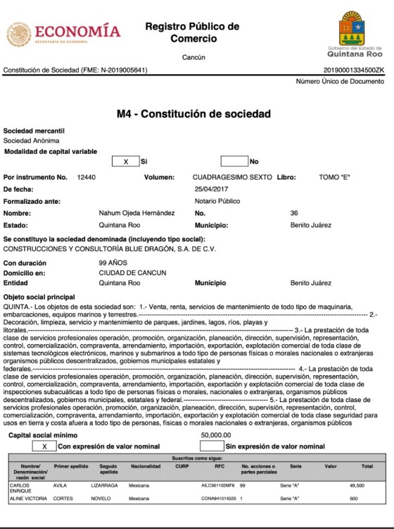 Construcciones y Consultoría Blue Dragón SA de CV, donde Ávila Lizárraga aparece como accionista junto a Aline Victoria Cortes Novelo, fue constituida en 2019 en Cancún y tiene como principal es explotar, operar o negociar con propiedades o negocios mineros.