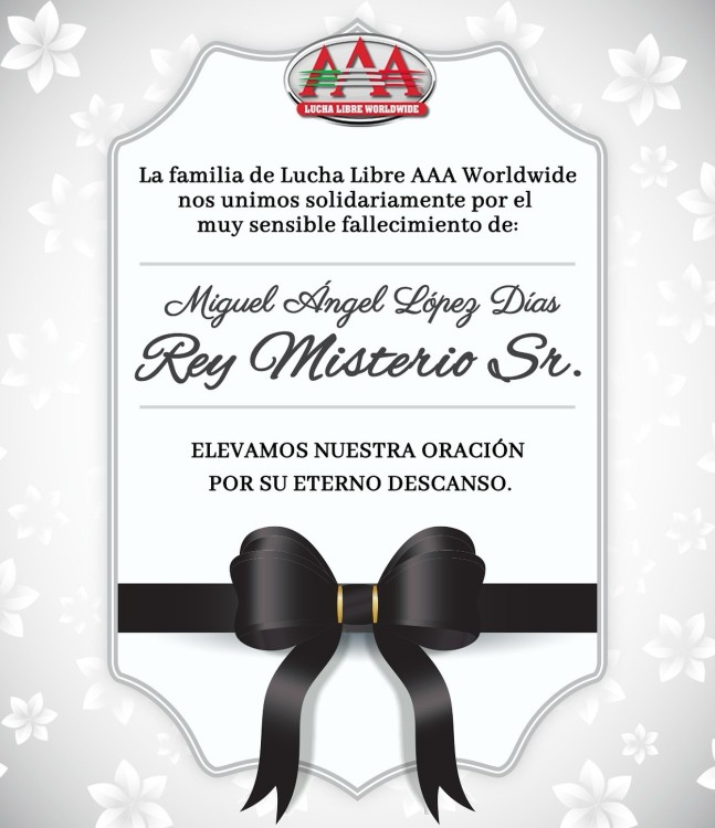 “Lamentamos el sensible fallecimiento de Miguel Ángel López Días, conocido como Rey Misterio Sr. Enviamos nuestro más sincero pésame a sus seres queridos y elevamos nuestras oraciones al cielo por su eterno descanso”, dijo la empresa.