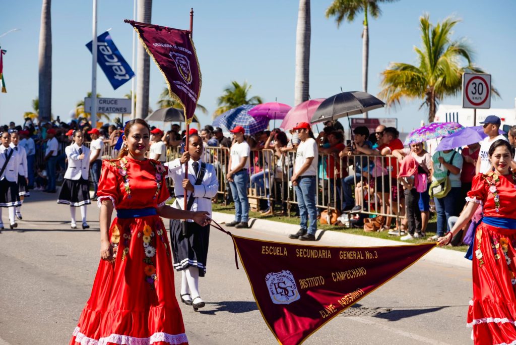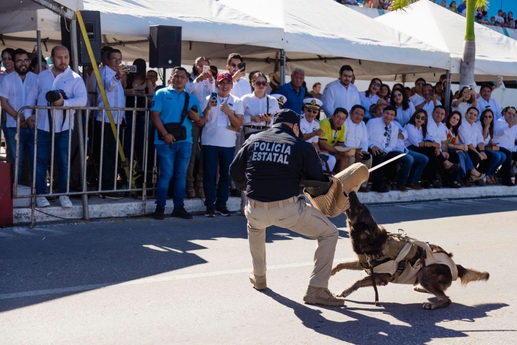 Así como el coordinador de la Guardia Nacional en Campeche, Israel Caro Martínez, presenciaron el despliegue de contingentes que presentaron desde demostraciones militares y tablas gimnásticas hasta coloridas estampas alusivas a la lucha armada revolucionaria.