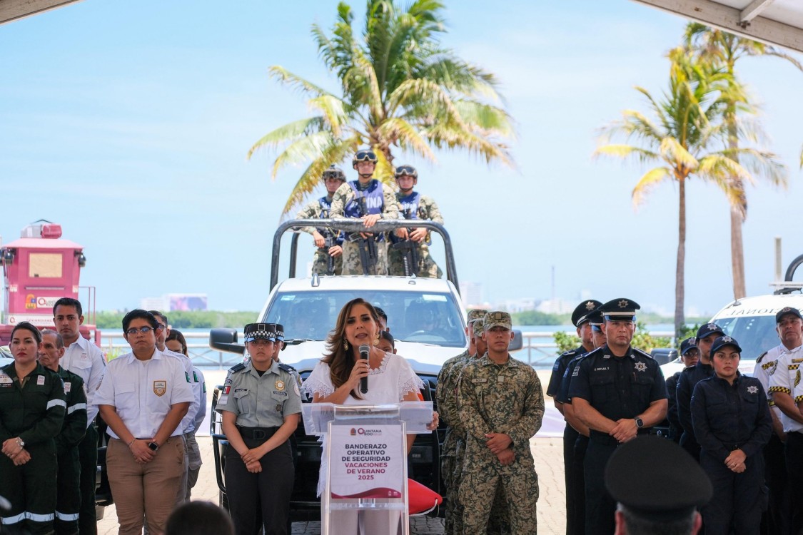 Cancún.- Para garantizar la seguridad, protección y la paz social en este periodo vacaciones a la población y a los más de 2 millones de turistas que se proyecta llegarán a Quintana Roo, la gobernadora Mara Lezama Espinosa junto con los titulares de los cuerpos de seguridad, fuerzas federales, protección ciudadana y rescate dieron el banderazo de inicio del Operativo de Seguridad Vacacional de Verano Quintana Roo 2025.