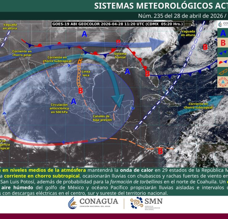Mientras tanto, un anticiclón en niveles medios de la atmósfera mantendrá tiempo estable y ambiente cálido a caluroso en el noroeste de la República Mexicana.