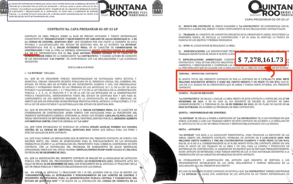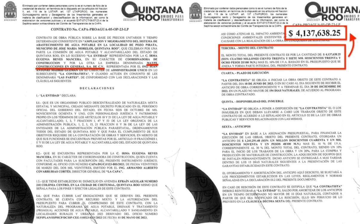 En la Secretaría de Obras Públicas, el año pasado obtuvo el contrato FAFEF-OP-019/2024, por $6,748,428.38 pesos, para la rehabilitación de arco y filtro carretero en la localidad de Chetumal; mientras que en septiembre de 2023, MAYPE firmó el contrato FAFEF-OP-018/2023, por