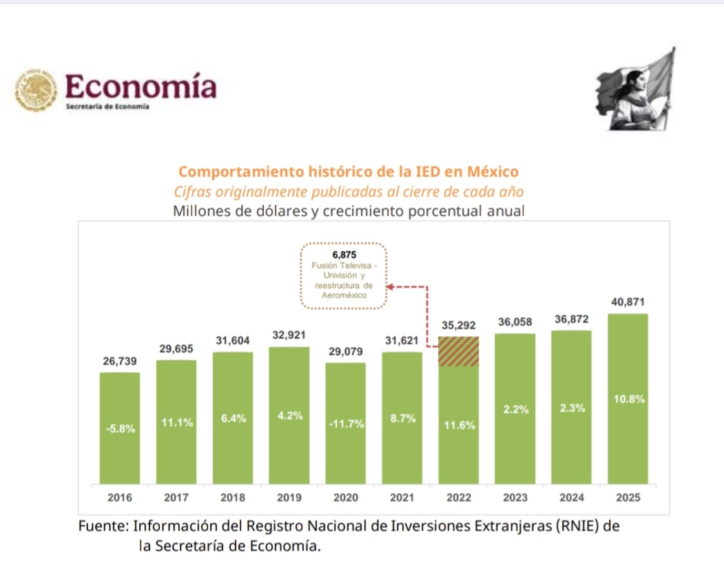 México rompe récord en IED en 2025 y consolida cinco años de crecimiento continuo