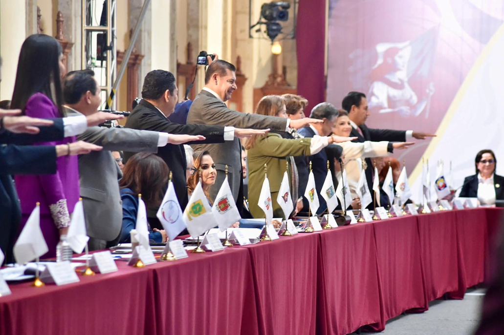 Ante los titulares de la SSPC federal, Omar García Harfuch, y de la FGR, Ernestina Godoy Ramos, la secretaria de Gobernación, Rosa Icela Rodríguez Velázquez, reconoció la disposición y trabajo coordinado con las y los gobernadores, con quienes ha sido posible llevar a cabo una estrategia de paz y seguridad desde los territorios, la cual involucra los esfuerzos de 53 dependencias federales.