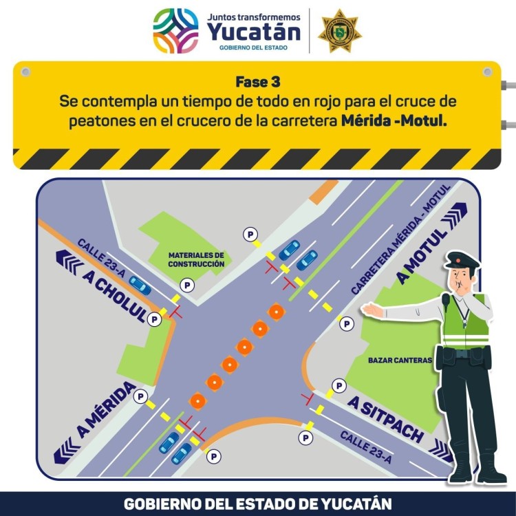 El Gobierno del Estado, a través de la Secretaría de Seguridad Pública (SSP), informa que, a partir del próximo martes 13 de agosto, se realizarán modificaciones a la movilidad vial en el entronque de la carretera Mérida – Motul con la carretera Cholul – Sitpach, con el objetivo de contribuir a mejorar la seguridad de peatones y conductores, así como la circulación en este importante cruce vehicular.