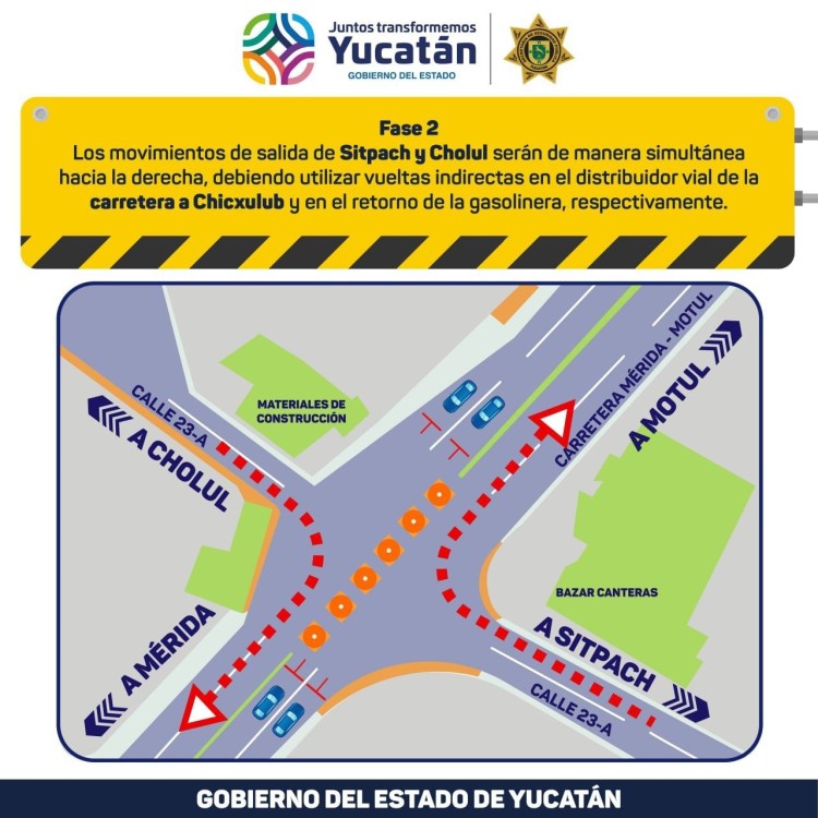 Asimismo, para los conductores que salen de Cholul por la calle 23-A para dirigirse a Sitpach o Motul, deberán tomar la derecha sobre la carretera Mérida – Motul, en dirección a la capital, hasta el primer retorno, regresando mediante vuelta en “U” y continuarán sobre la carretera para Motul o a la derecha para dirigirse con destino a Sitpach.
