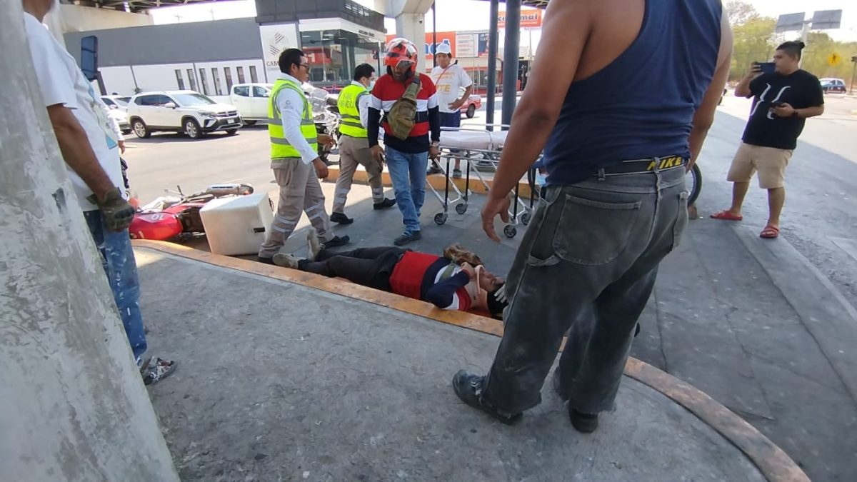 Motociclista se pasa el alto y origina aparatoso choque en la Avenida Gobernadores de Campeche resultando seriamente lesionado y siendo llevado de emergencia a un hospital.