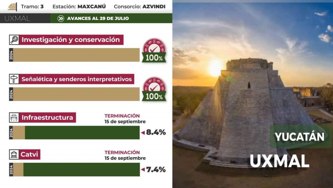 Se tiene avance de 57 por ciento y se espera su culminación el 30 de diciembre de 2024; y en el Museo de Sitio de Dzibilchaltún, que se construye en el sitio homónimo, se lleva 53.83 por ciento de avance, a fin de terminar sus obras el 15 de septiembre de 2024.