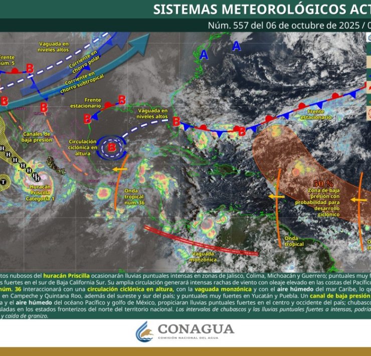 La gobernadora de Quintana Roo, Mara Lezama Espinosa, alertó que el Potencial Ciclón Tropical Número 9 se encuentra a 205 km al sur-suroeste de Gran Caimán y a 605 km al este-sureste de Punta Herrero, Quintana Roo. Con vientos sostenidos de 45 km/h, se anticipa que los municipios afectados por ciclón “Helene” sufrirán lluvias intensas, con precipitaciones que podrían alcanzar de 75 a 150 mm.