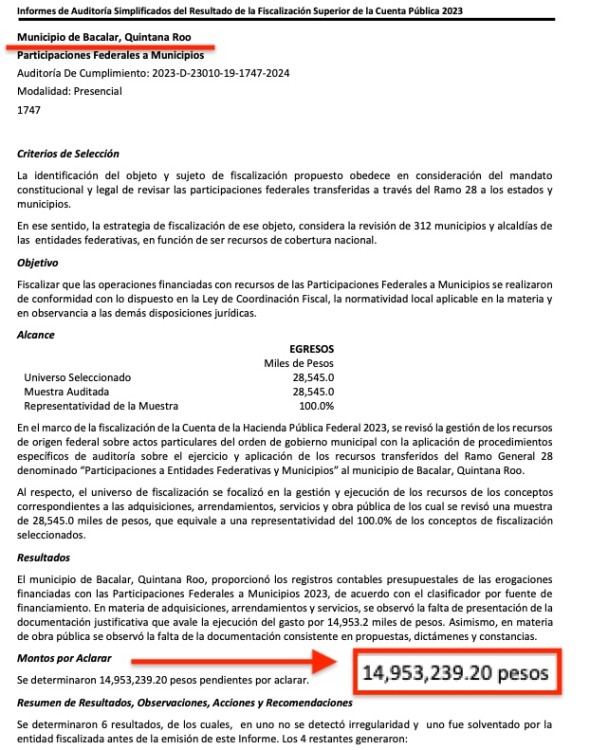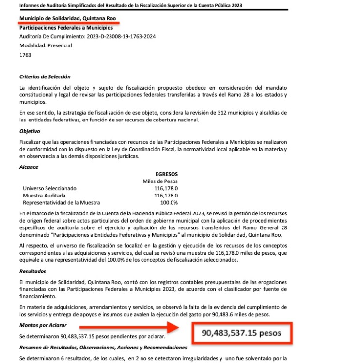 La tercera entrega de resultados a la cuenta pública 2023 de la Auditoria Superior de la Federación, arrojó que los municipios de Quintana Roo deben aclarar a la Federación un monto total de $456 millones 292 mil 167.04 pesos; siendo los municipios con más irregularidades: Benito Juárez, con $291 MDP pendientes de aclarar; solidaridad, con $90.4 MDP; y Bacalar, con $33.2 millones de pesos en probables irregularidades.