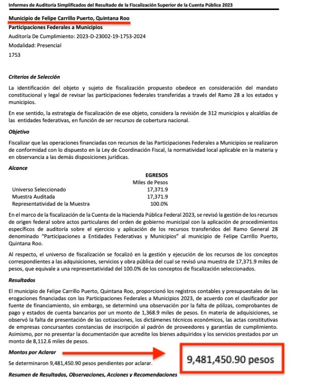 Felipe Carrillo Puerto, de la morenista Mary Hernández, incurrió en inobservancias de la normativa, lo que generó una cuantificación monetaria de las observaciones por un total de $513,224.42 pesos; y en otra auditoría, se determinó una observación por la falta de pólizas, comprobantes de pago y estados de cuenta bancarios. En materia de adquisiciones, se observó la falta de presentación de las cotizaciones, los dictámenes técnicos económicos, las actas constitutivas de empresas concursantes constancias de inscripción al padrón de proveedores y garantías de cumplimiento. Asimismo, por no presentar la documentación que acredite los bienes adquiridos y los servicios prestados, El total de irregularidades fue de $9,481,450.90 pesos