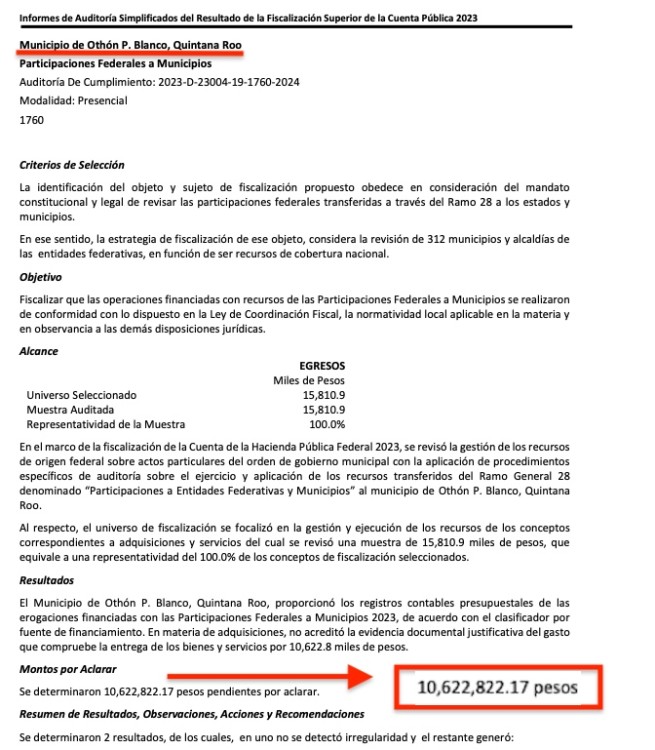 A Othón P. Blanco, gobernado por la morenista Yensunni Martínez Quintana Roo, se le realizaron tres auditorias; en la primera durante la realización de la misma se recuperaron recursos por 941,442.00 pesos; en la segunda, en materia de adquisiciones, no acreditó la evidencia documental justificativa del gasto que compruebe la entrega de los bienes y servicios por $10,622,822.17 pesos y en la tercera: en 3 contratos no presentó la evidencia fotográfica para verificar los números de serie de las maquinas adquiridas, por lo que tiene un monto por aclarar de $4,532,700 pesos.