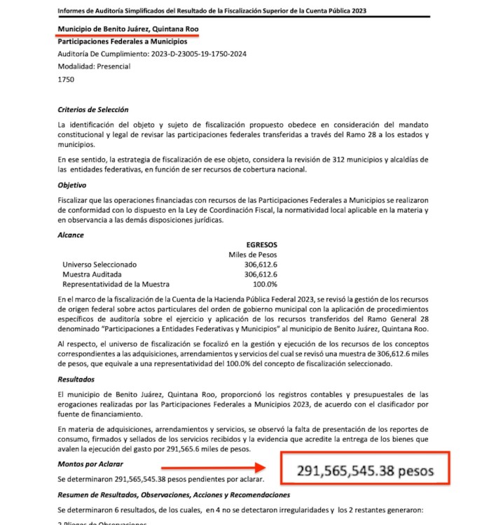 El probable daño a la Hacienda Pública, representó el 95.1% de la muestra auditada por la ASF, quien concluyó que el municipio de Benito Juárez, Quintana Roo, no realizó una gestión eficiente de los recursos de las Participaciones Federales a Municipios 2023.