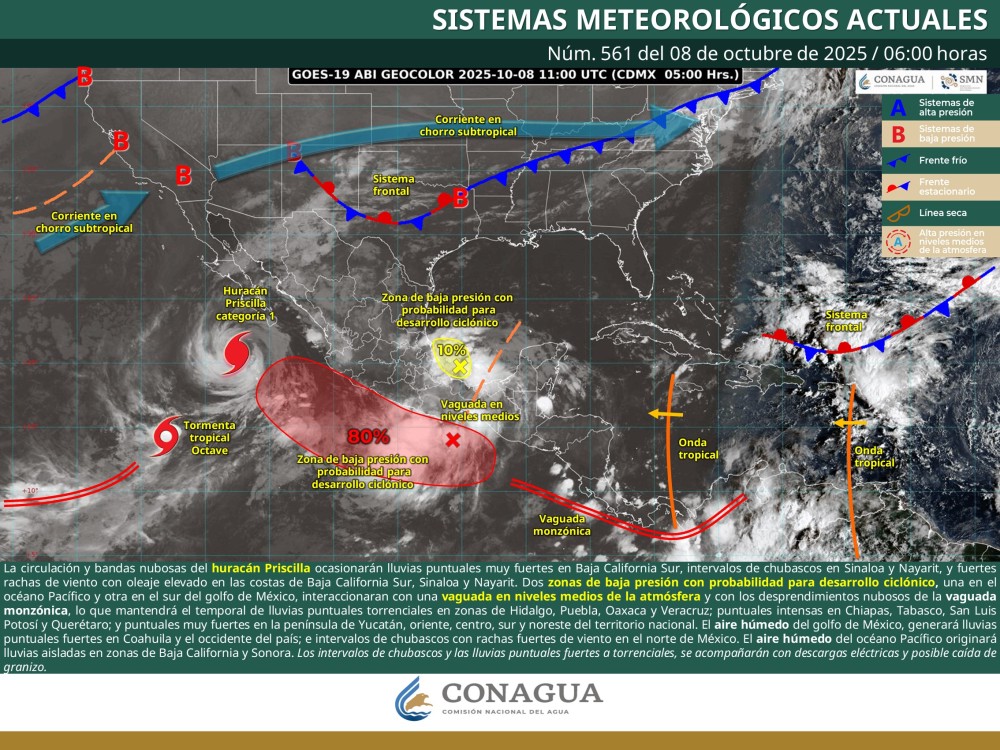 Para información actualizada, el SMN mantiene disponibles los avisos oficiales sobre los ciclones tropicales Octave y Priscilla en el Pacífico, así como del ciclón tropical Jerry en el Atlántico.