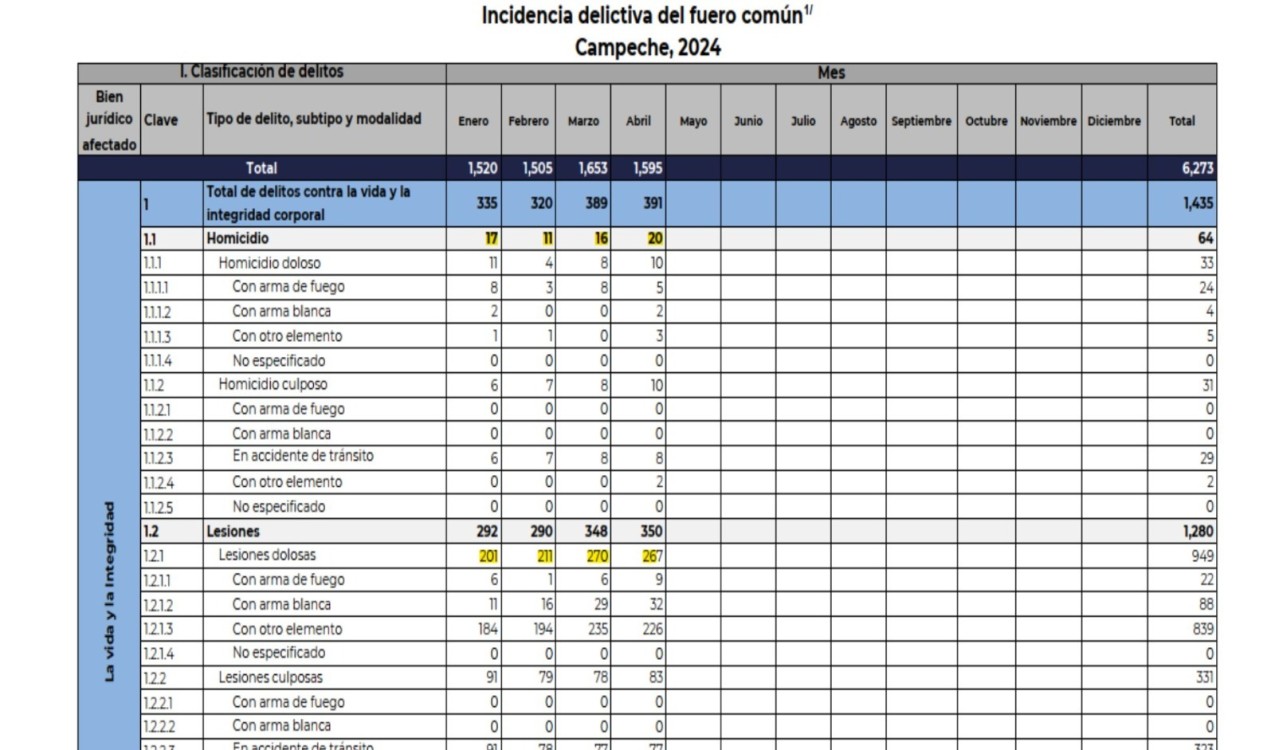 En los primeros cuatro meses la estadística Sistema Nacional de Seguridad, se especifica que se presentaron 64 homicidios en el estado de Campeche, de los cuales, 33 fueron homicidios dolosos, 24 con arma de fuego, 4 con arma blanca y 5 con otro elemento. En el mes de enero, se registraron 8 homicidios con arma de fuego, en febrero 3, en marzo 8 y en abril 5; mientras que, con arma blanca, 2 en enero, cero en febrero, cero en marzo y 2 en abril; con otro elemento, uno en enero, uno en febrero, cero en marzo y 3 en abril.