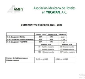 La Asociación Mexicana de Hoteles en Yucatán presentó su comparativo de ocupación hotelera correspondiente a febrero de 2025 y febrero de 2026, donde se observa un comportamiento mixto en los principales indicadores del estado.