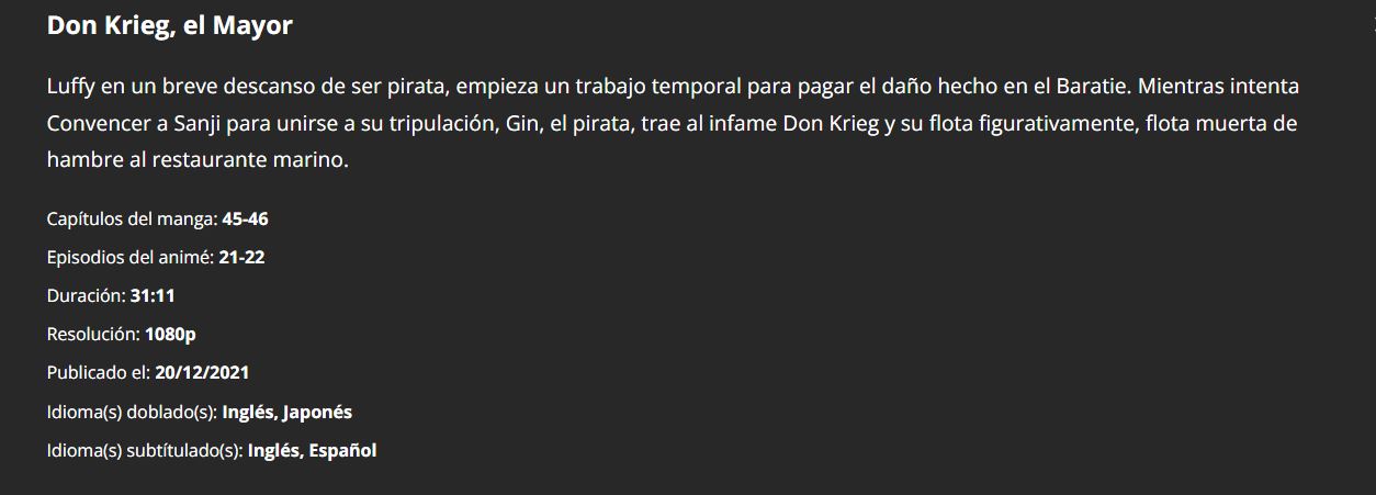 De igual forma nos da una breve sinopsis del episodio, los capítulos del manga que abarca, y cuales son los capítulos del anime original. Solo cuenta con un inconveniente que puede ser molesto para muchos y es que cada capitulo solo se puede ver y descargar en Telegram. Cuando selecciones un episodio, te enviará al grupo de Telegram de “One Pace”. Nuestra recomendación personal es que lo usen de guía para poder ver los episodios en otro lado como Netflix. Si no tienes problema con esto, aquí dejamos el link al grupo. https://t.me/onepacesp