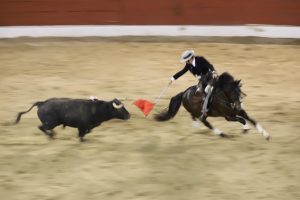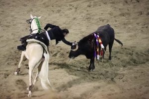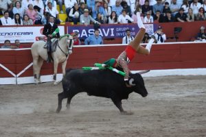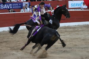 Al parecer el mejor de la tarde con 500 kilos, cumplió de buena manera al castigarlo, cabalgando por todo el ruedo, arriesgando muy cerca de la cornamenta haciendo piruetas y giros para agradar al respetable a ritmo de música jaranera.
