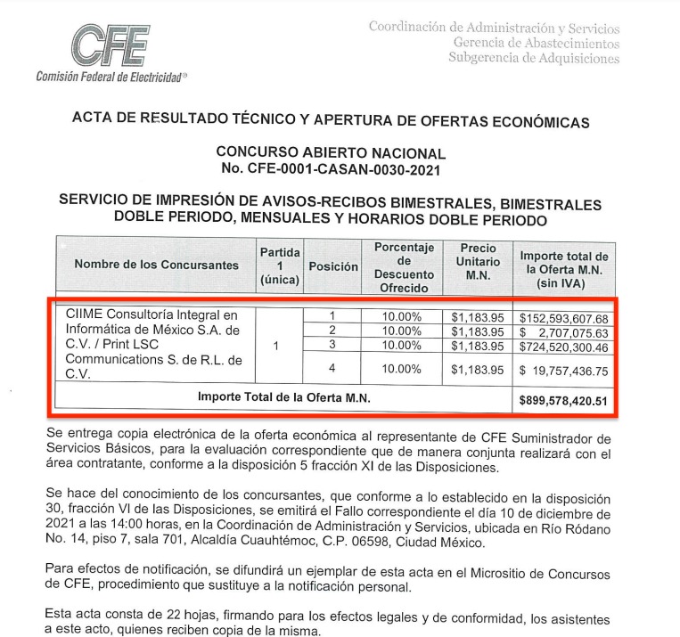 El pasado 28 de noviembre entregó por adjudicación directa el contrato por un monto de $1,483 millones 780 mil 975.26 pesos ($1,721 millones 185 mil 931.30 pesos con IVA incluido). Según el oficio No. SSB-02-151/2024 los servicios son para el servicio de impresión, aviso de recibo 2025-2027 para los más de 48 millones de usuarios finales a nivel nacional que tiene la CFE y donde se especifique el importe facturado por consumo de energía eléctrica.