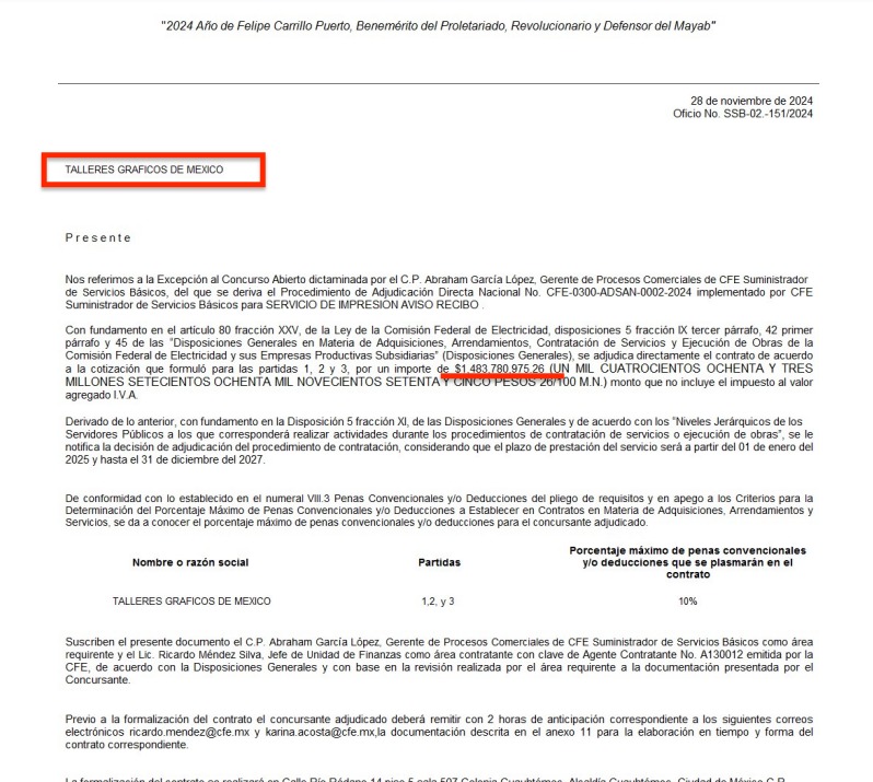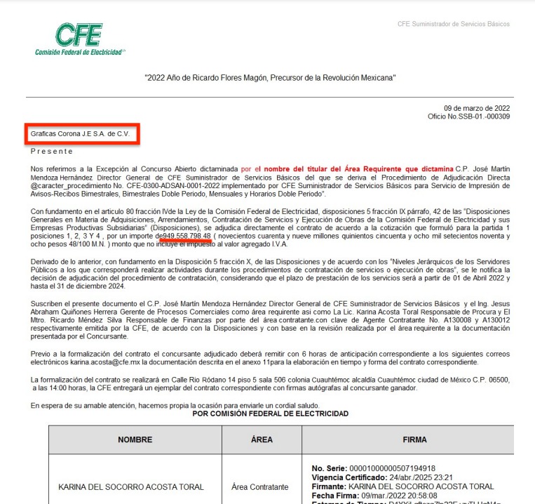 El pasado 28 de noviembre entregó por adjudicación directa el contrato por un monto de $1,483 millones 780 mil 975.26 pesos ($1,721 millones 185 mil 931.30 pesos con IVA incluido). Según el oficio No. SSB-02-151/2024 los servicios son para el servicio de impresión, aviso de recibo 2025-2027 para los más de 48 millones de usuarios finales a nivel nacional que tiene la CFE y donde se especifique el importe facturado por consumo de energía eléctrica.