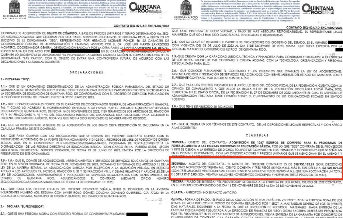 De hecho, el contrato SEQ-021-AD-EXC-ADQ-2023 para la adquisición de 1267 equipos de cómputo para el Programa de Fortalecimiento a las figuras Directivas de Educación Básica fue el primer gran contrato que la empresa OPELVENT firmó con el gobierno de Quintana Roo.