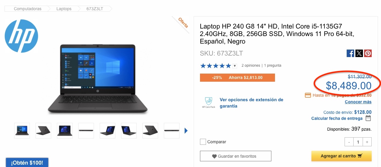 Según el contrato y la cotización recibida, los equipos adquiridos tienen las siguientes características: Laptop HP 240 G8 14″ HD, Intel Core i5-1135G7 2.40GHz, 8GB, 256GB SSD, Windows 11 Pro 64-bit y según el portal mexicano especializado en la venta de computadoras Cyberpuerta el precio minorista de una laptop de similares características es de alrededor de $8 mil 489 pesos.