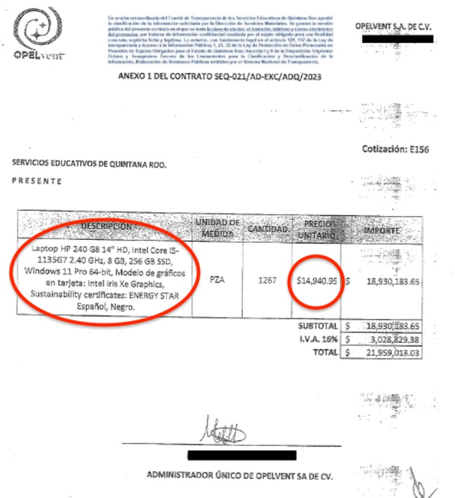 Al finalizar el año 2023, la Secretaria de Educación, a través de los Servicios Educativos de Quintana Roo (SEQ), adquirió por adjudicación directa-sin licitación de por medio- 1,267 laptops a la empresa intermediaria cancunense OPELVENT SA de CV, constituida apenas el año 2019, por el que pagó a evidente sobreprecio la suma total de 21 millones 959 mil 13.03 pesos.