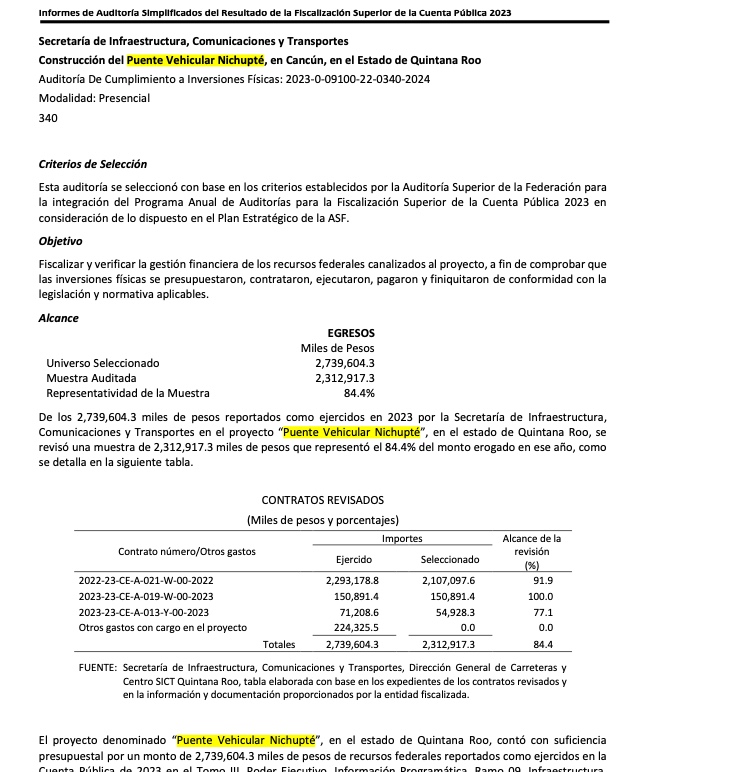 Con base en los resultados obtenidos en la auditoría practicada, cuyo objetivo fue fiscalizar y verificar la gestión financiera de los recursos federales canalizados al proyecto “Puente Vehicular Nichupté”, en el estado de Quintana Roo, la ASF concluyó que durante el Ejercicio 2023 se detectaron pagos en excesos a la empresa ICA.