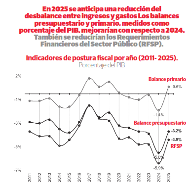 De materializarse estas estimaciones, se observaría una reducción del déficit presupuestario o tradicional, que mide la diferencia entre los ingresos presupuestarios y el gasto neto pagado del sector público, al disminuir de 1.69 a 1.17 billones de pesos. Esto representaría una reducción de 1.8 puntos porcentuales del PIB, al pasar de 5.0% en 2024 a 3.2% en 2025.