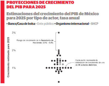 Si bien la Secretaría de Hacienda y Crédito Público (SHCP) busca reducir el déficit del sector público del 5.9% del PIB en 2024 al 3.9% en 2025 para mantener la deuda pública alrededor del 51.4% del PIB, la viabilidad de este ajuste es incierta. Esto se debe a que su principal supuesto, un crecimiento económico de entre 2.0% y 3.0% en 2025, no coincide con las proyecciones de diversas instituciones.