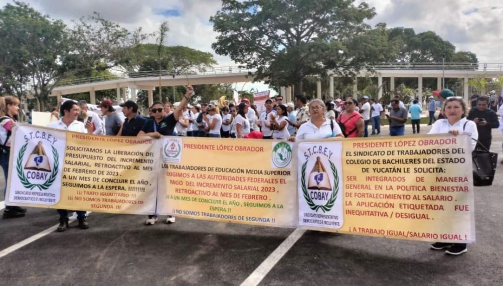 Esta movilización, convocada por el Sindicato de Trabajadores del Colegio de Bachilleres del Estado de Yucatán (STCBEY), integró a más de 2 mil empleados a participar en un paro laboral escalonado.