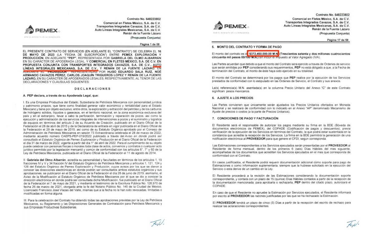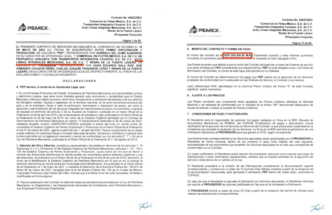 Aún hay más: pues el pasado 7 de diciembre de 2023, Pemex Exploración y Producción le entregó a las mismas empresas: Comercial en Fletes México SA de CV, Transportes Integrados Cavazos SA de CV, Auto Líneas Integrales Mexicanas SA de CV y Renán de la Fuente Lázaro acapararon otros cuatro contratos: 648223837 para el manejo y transporte de fluidos de control para la perforación, terminación y reparación de pozos en campos terrestres de PEP, Activos de Producción Macuspana-Muspac y Samaria- Luna por 261 millones de pesos; 648223838 para el manejo y transporte de fluidos de control para la perforación, terminación y reparación de pozos en campos terrestres de PEP, Activos de Producción Bellota-Jujo y Cinco Presidentes por 445 millones 950 mil pesos; 648223840, por el manejo y transporte de agua para la perforación, terminación y reparación de pozos en campos terrestres de PEP, Activos de Producción Región Sur por 100 millones 624 mil 914.39 pesos; 648223841 para el manejo y transporte de combustible para la perforación, terminación y reparación de pozos en campos terrestres de PEP, Activos de Producción Región Sur por 111 millones 628 mil 953.87 pesos.
