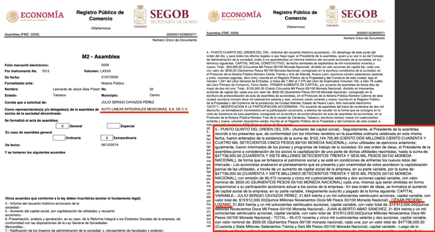 En una Asamblea de socios efectuada el 13 de noviembre de 2018, Pecero Lozano ya aparece como socio, pues en la escritura se señala textualmente que “Julio Sergio Cavazos Pérez posee 100 acciones con valor de 50 mil pesos; César Pecero Lozano, posee 50 acciones con valor de 50 mil pesos y Juan Alberto Abad Sánchez con 100 acciones con valor de 50 mil pesos”.