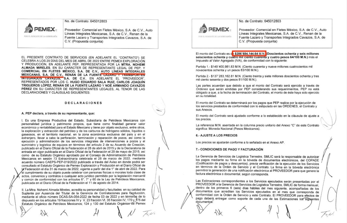 Vamos por partes: el primero de los contratos, el 645012803 fue firmado el 29 de abril de 2022 y tiene como objetivo el manejo de hidrocarburos, condensados y agua por autotanques de los campos de los Activos de Producción de PEP (Partida 1 y 2) por un monto total de 286 millones 684 mil 144.64 pesos.