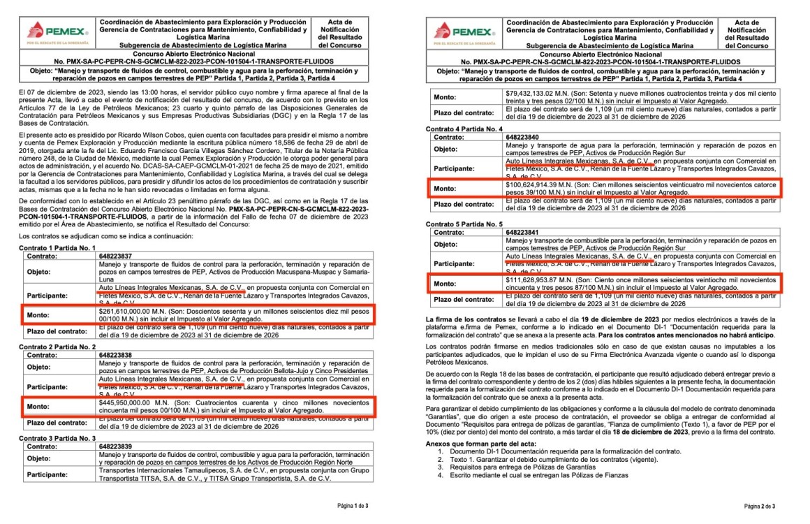 Los otros dos contratos 648223803 y 648223802 fueron firmado el mismo día 16 de mayo de 2023, el primero es para el manejo de hidrocarburos, condensados y agua por autotanques de los campos de los Activos de Producción Bellota-Jujo y Cinco Presidentes por un monto de 397 millones 550 mil 500 pesos, y el segundo es para el para el manejo de hidrocarburos, condensados y agua por autotanques de los campos de los Activos de Producción Macuspana-Muspac y Samaria-Luna por un monto de 372 millones 450 mil pesos.