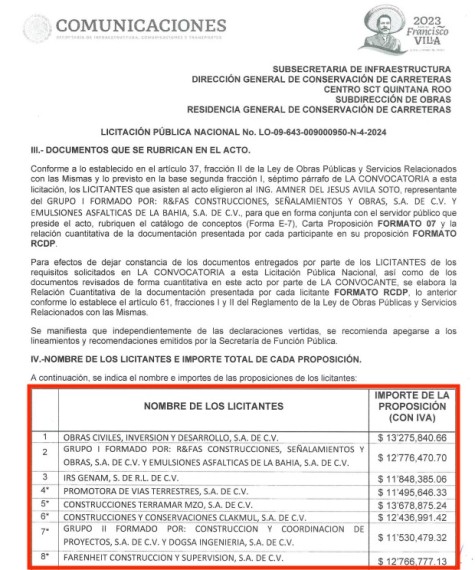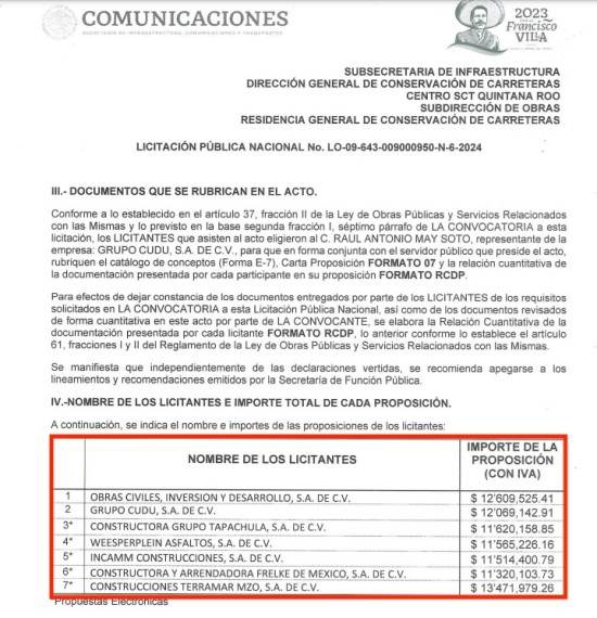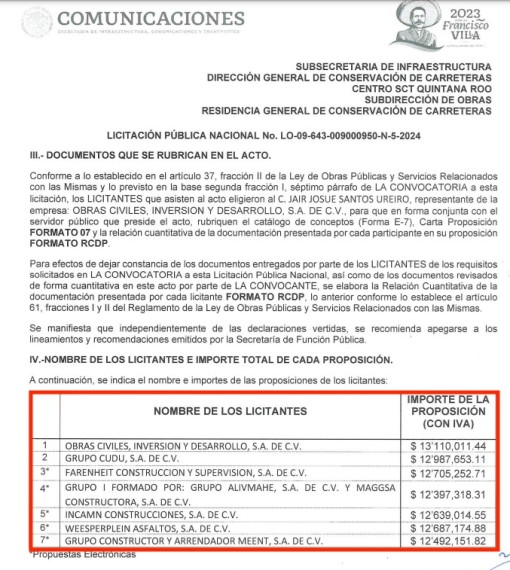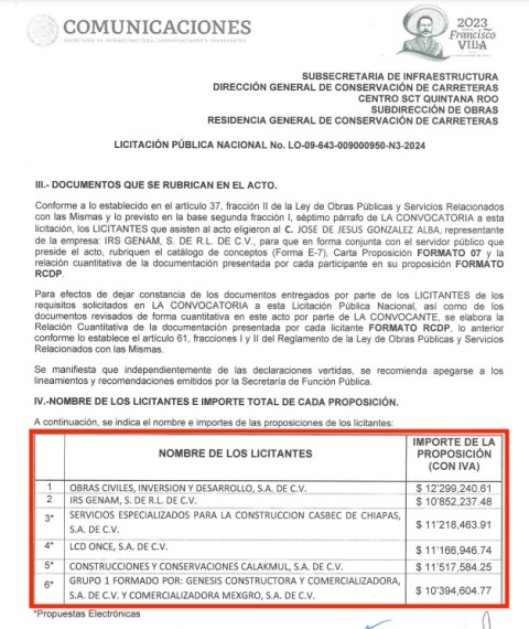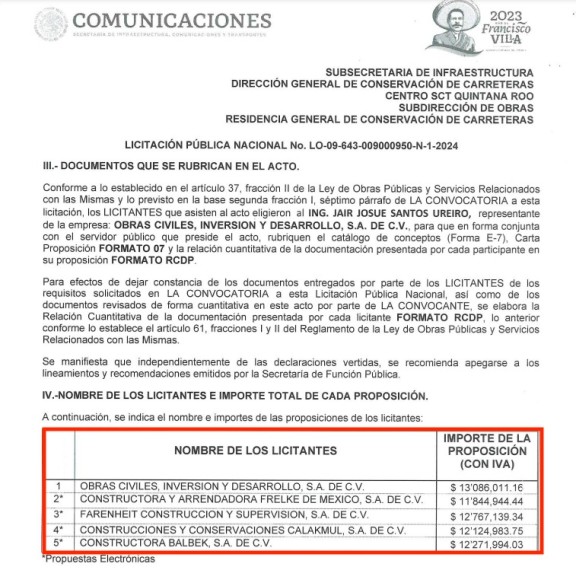 En la licitación LO-09-643-009000950-N-3-2024 para la conservación rutinaria de tramos en 150.13 km, de las rutas 184 carretera Mérida- Felipe Carrillo Puerto y 293 carretera Lázaro Cárdenas-Polyuc, se presentaron seis ofertas: Génesis Constructora y Comercializadora SA de CV y Comercializadora MEXGRO SA de CV (de Acapulco y Chilpancingo, Guerrero, respectivamente), con $10,394,604.77 pesos; IRS Genam S de RL de CV (Cancún, Q. Roo), $10,852,237.48; LCD-Once SA de CV (Toluca, EDOMEX), $11,166,946.74; Servicios Especializados para la Construcción CASBEC de Chiapas SA de CV (Tuxtla Gutiérrez, Chiapas), $11,218,463.91; Construcciones y Conservaciones Calakmul SA de CV (Campeche, Campeche) $11,517,584.25; y Obras Civiles, Inversión y Desarrollo SA de CV (Durango, Durango), con $12,299,240.61 pesos.