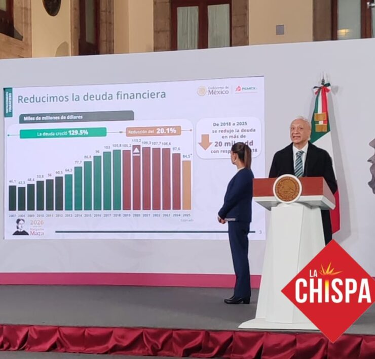 Durante su informe presentado en la conferencia matutina del presidente Andrés Manuel López Obrador, Romero Oropeza destacó que, a pesar de que en los dos últimos sexenios la deuda de Pemex se duplicó, durante la actual administración no solo se ha mantenido al corriente, sino que ha disminuido considerablemente.