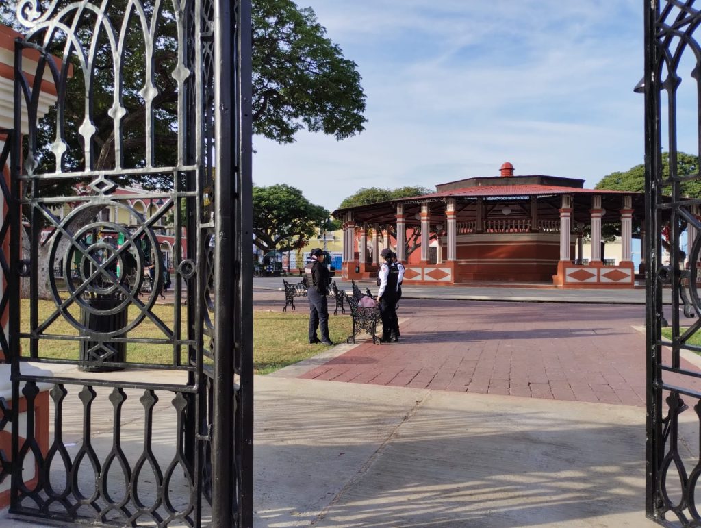 Biby Rabelo llegó hasta el parque principal y cuestionó al agente de nombre Juan Balché Vázquez. Este solamente le dijo que son instrucciones de sus superior y que requieren un oficio de la SPSC.