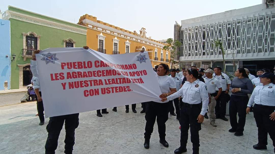 Policías protestan en Palacio de Gobierno de Campeche ante la falta de respuesta de las autoridades estatales entorno al conflicto de más de 60 días.