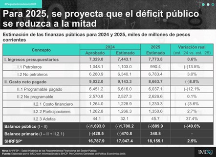 De materializarse las estimaciones de la Secretaría de Hacienda en cuanto al crecimiento de los ingresos y la disminución del gasto, en 2025 se reduciría a la mitad el déficit público y se alcanzaría un superávit primario por primera vez desde 2020. El déficit presupuestario estimado para 2025 asciende a 889.9 mmdp, por lo que es (-)49.6% menor, en términos reales, al esperado para 2024 (1.70 billones de pesos). Como porcentaje del PIB, el déficit pasaría de 5.0% a 2.5% entre esos años.